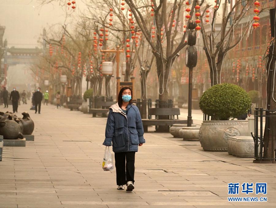3月15日,行人走在北京前門商業(yè)街。當日,我國北方多地出現(xiàn)沙塵天氣。新華社記者 張晨霖 攝