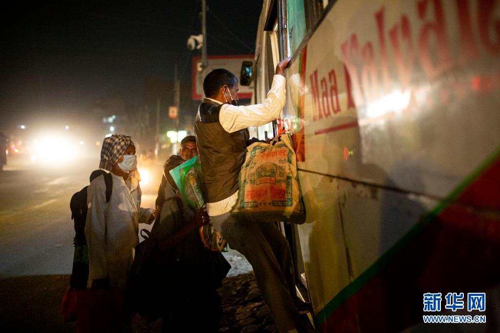 4月29日凌晨,人們在尼泊爾首都加德滿都登上長途客車,準備在封禁措施實施前離開加德滿都返回家鄉(xiāng)。