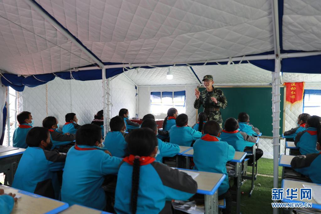 5月24日,武警青??傟牴逯ш牂C動大隊排長張國睿為花石峽鎮(zhèn)藏文中心寄宿制小學的孩子上課。新華社記者 劉新 攝