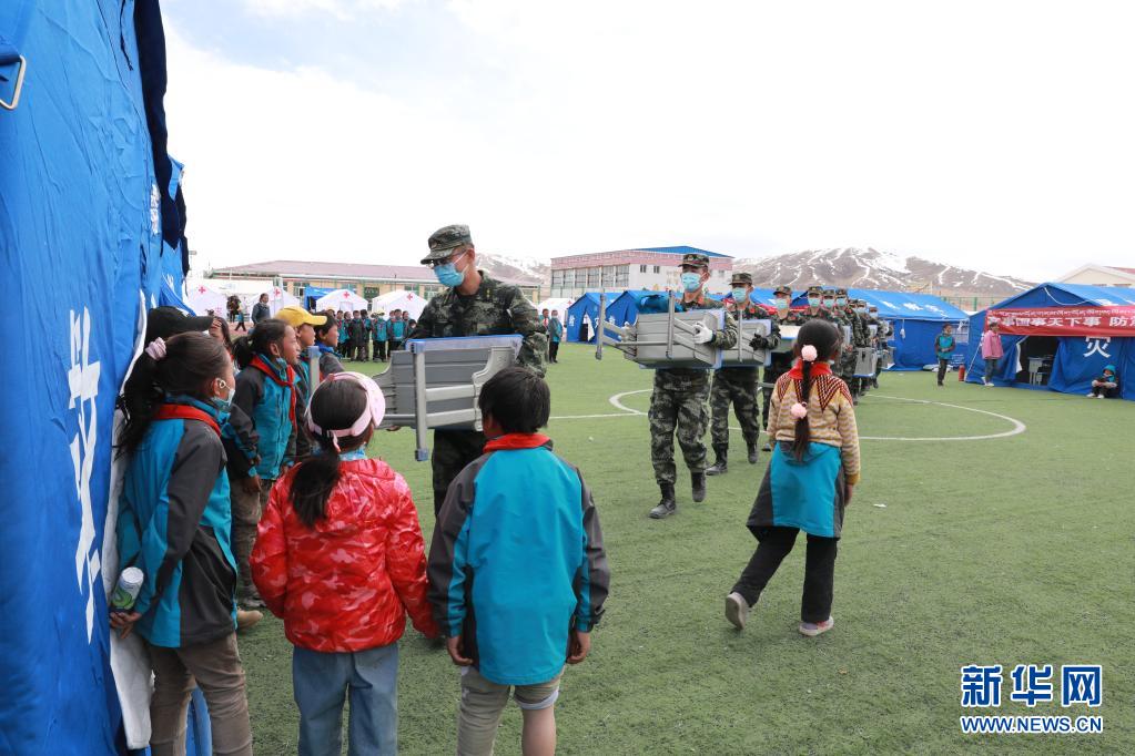 5月24日,武警青??傟?duì)果洛支隊(duì)機(jī)動(dòng)大隊(duì)排長張國睿(前一)和戰(zhàn)友為花石峽鎮(zhèn)藏文中心寄宿制小學(xué)的帳篷教室搬運(yùn)課桌。新華社記者 劉芳 攝