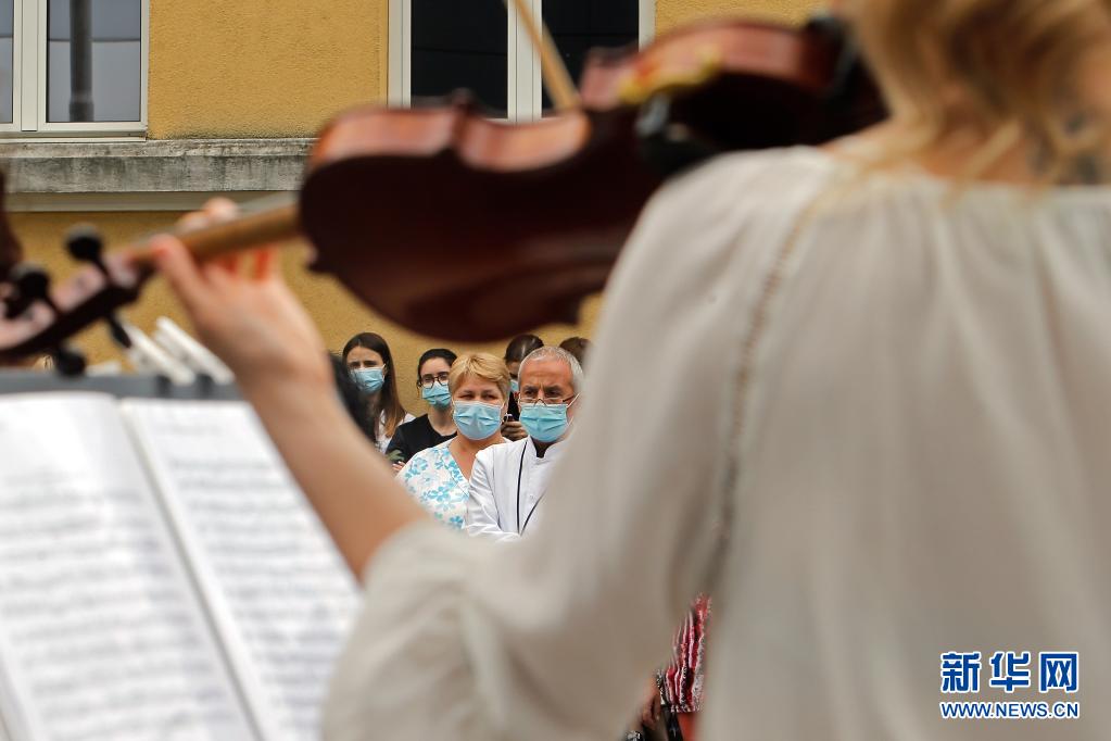 當(dāng)日,羅馬尼亞首都布加勒斯特一個(gè)樂(lè)隊(duì)在該國(guó)一家傳染病醫(yī)院——馬太·巴爾什醫(yī)院演出,向抗擊新冠疫情的醫(yī)務(wù)工作者致謝。