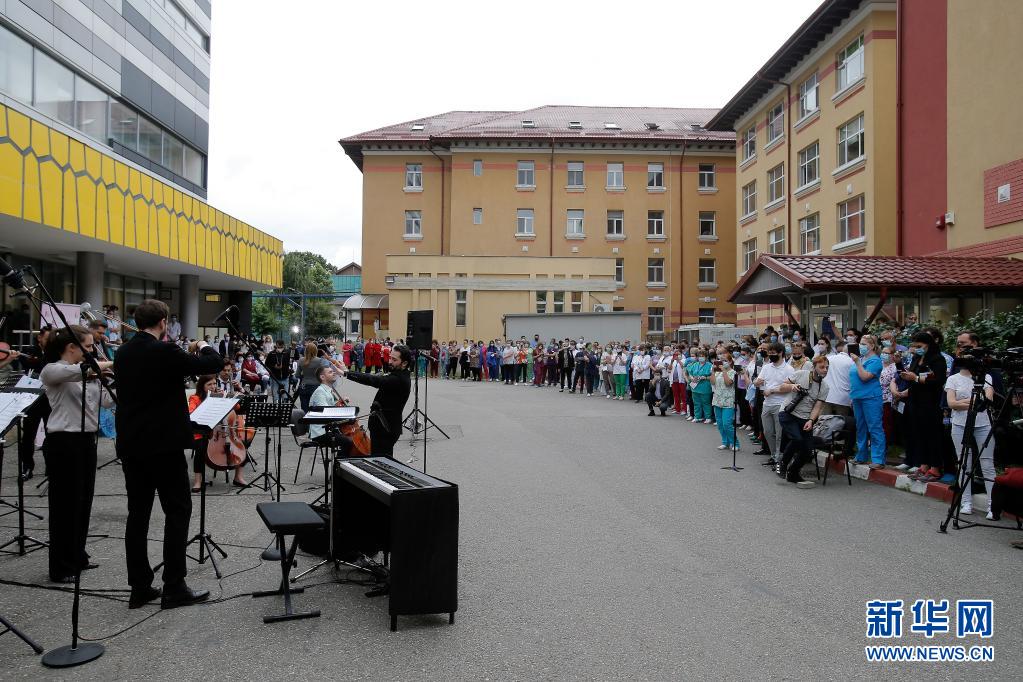 當日,羅馬尼亞首都布加勒斯特一個樂隊在該國一家傳染病醫(yī)院——馬太·巴爾什醫(yī)院演出,向抗擊新冠疫情的醫(yī)務(wù)工作者致謝。