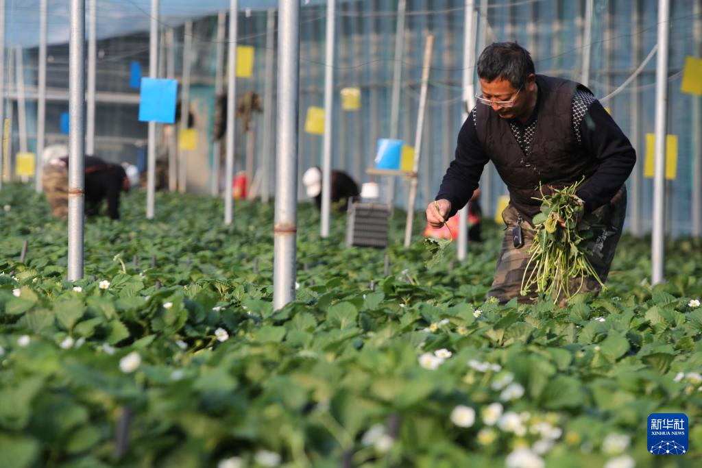 12月6日,在山东省威海市文登区文登营镇,工人管理草莓。