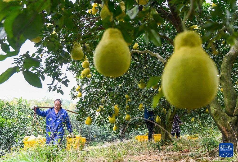 12月6日,在湖南省永州市道县梅花镇赤源村三和希望农场,农民在收获柚子。