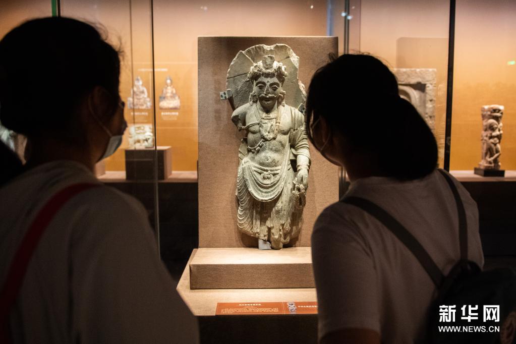 7月10日,觀眾在湖南省博物館觀看巴基斯坦出土的文物“灰片巖觀音菩薩像”。新華社記者 陳思汗 攝