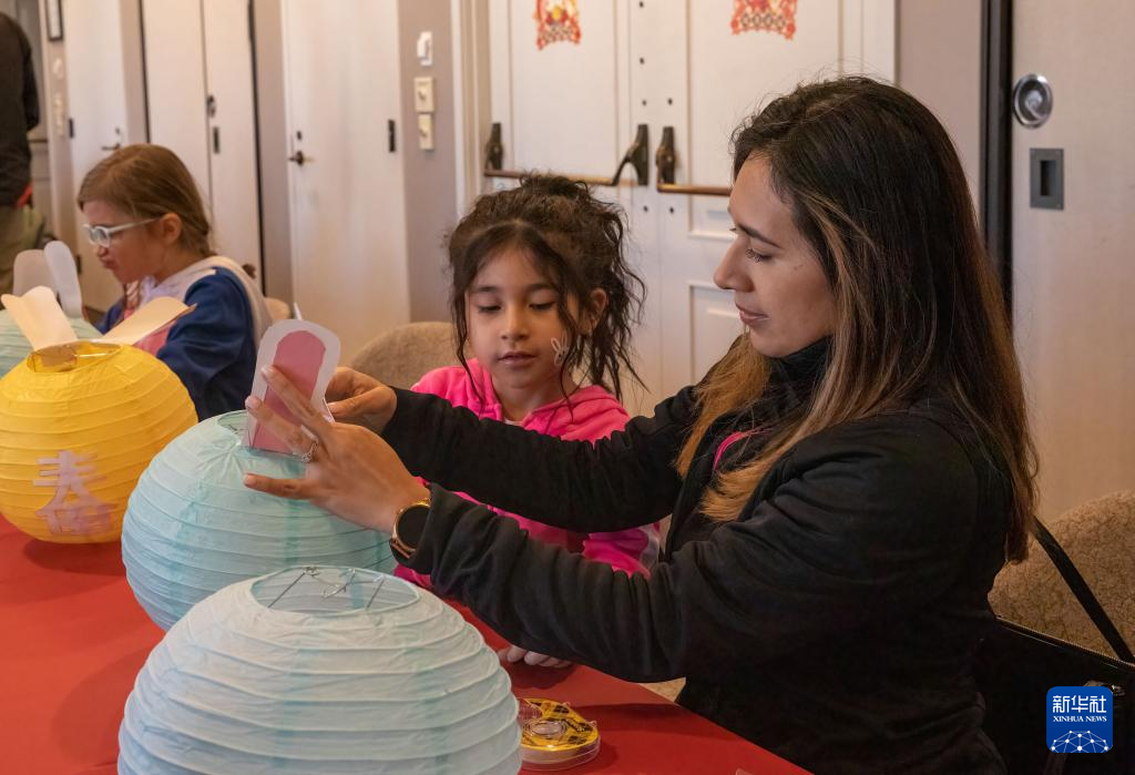 2月4日,在美国得克萨斯州绍斯莱克市的元宵节庆祝活动上,人们体验制作灯笼。