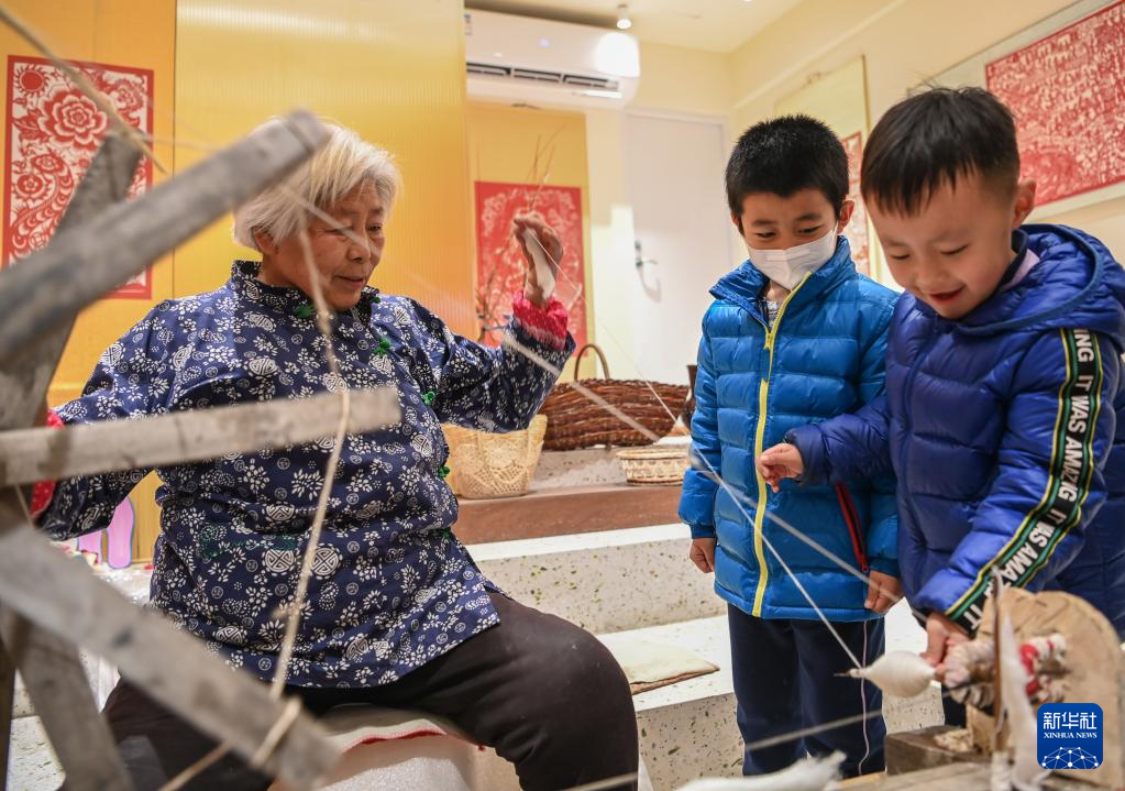 在榆林老街非遗大集的非遗展馆内,非遗传承人王秀芳(左)展示纺线织布技艺(2月17日摄)。