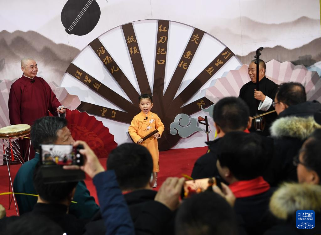 游客在榆林老街的非遗展馆内观看南阳三弦书表演(2月17日摄)。