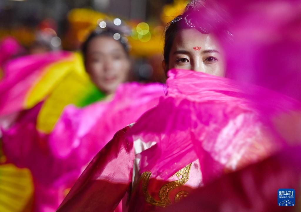 演员在榆林老街非遗大集开集仪式上表演秧歌(2月17日摄)。