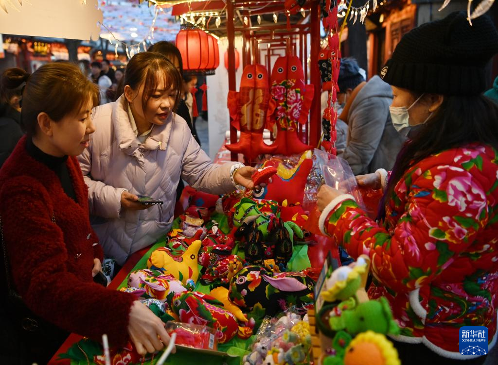 游客在非遗大集上购买潍县布玩具(2月17日摄)。
