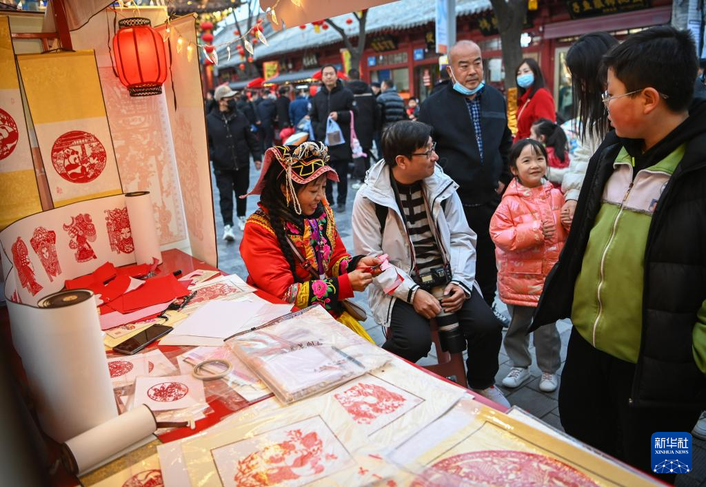 游客在榆林老街的非遗大集上欣赏剪纸技艺(2月17日摄)。