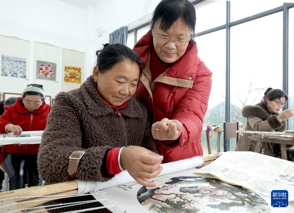3月21日,当地农民画家潘宇的妻子徐玉兄(右)指导绣娘刺绣。