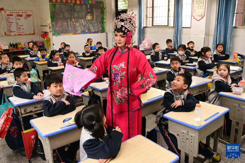 当日是世界戏剧日,江西省宜春市万载县花灯戏剧团演员来到当地第二小学,为学生们讲解和表演花灯戏,让孩子们近距离感受传统戏剧文化的魅力。