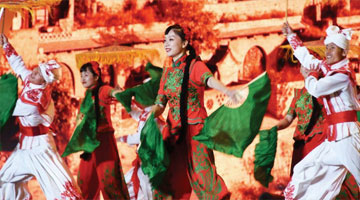 4月22日,在中国—东盟(南宁)非物质文化遗产周开幕现场,演员在表演少数民族歌舞。
