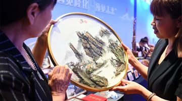 5月16日,民间艺人张林展示满族手工剪纸技艺。