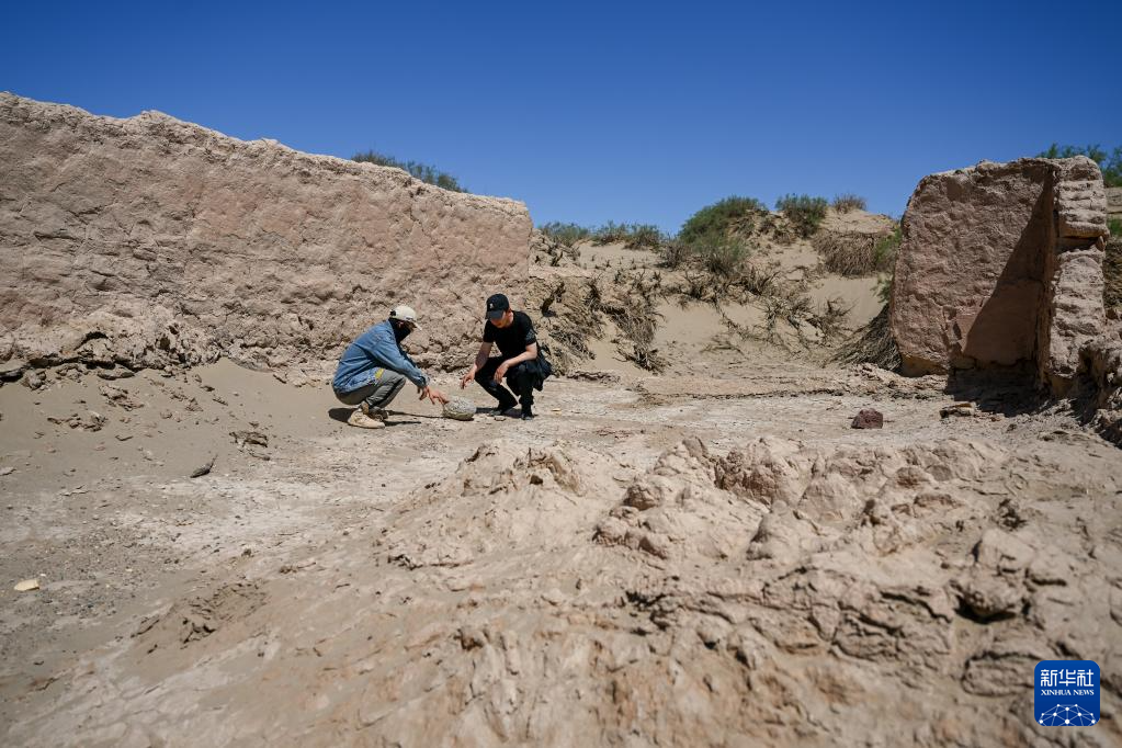 6月2日,额济纳旗文物保护中心工作人员在居延遗址附近查看散落的石碾。