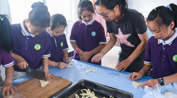 在位于杭州临安吴越文化公园的“地道吴越”民间手工艺文化空间内,孩子们在老师的带领下学习木版年画拓印技艺(5月14日摄)。该文化空间集临安非遗、临安民艺、文创研学、休闲体验为一体,近百件临安民艺产品在这里汇集。