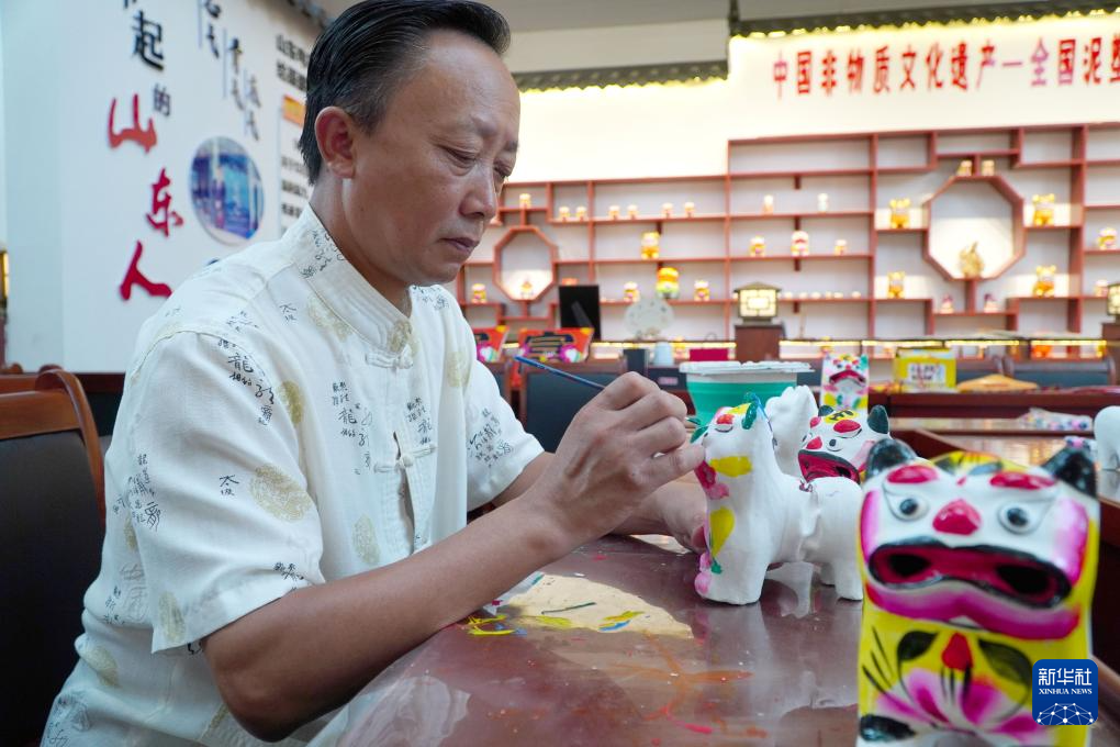 9月5日,在山东省高密市姜庄镇的一处非遗工坊,非遗代表性传承人聂宏希在制作泥老虎产品。