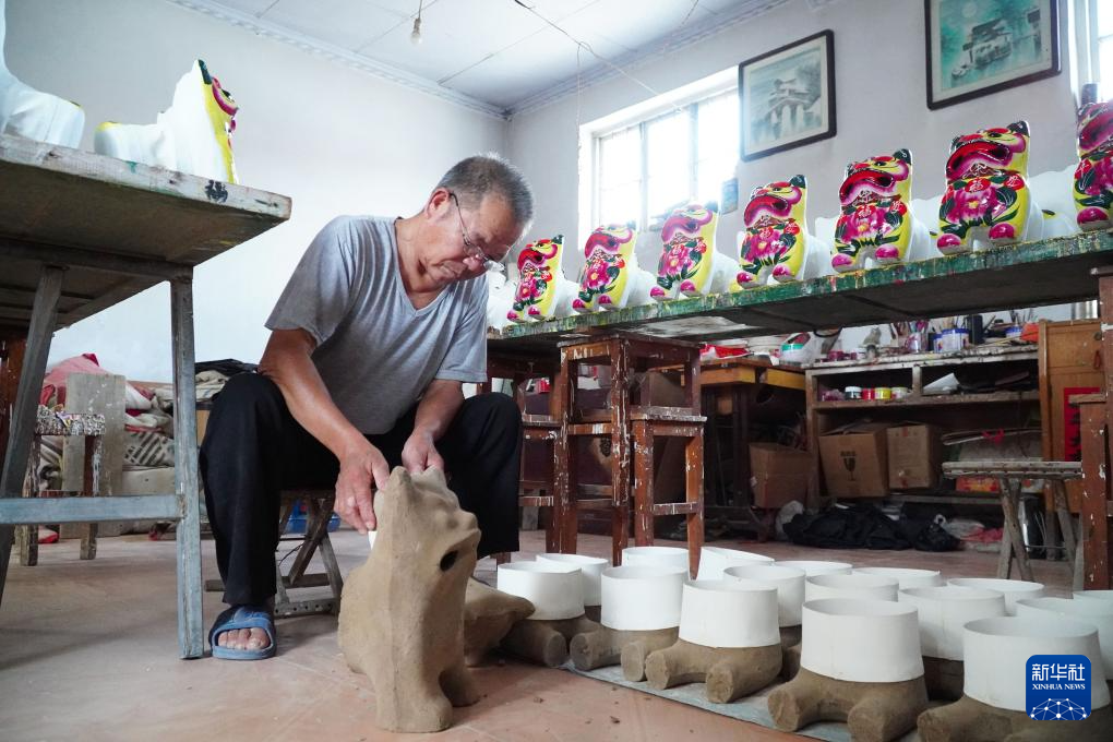 9月5日,在山东省高密市姜庄镇的一处非遗工坊,村民聂祥之在制作泥老虎产品。