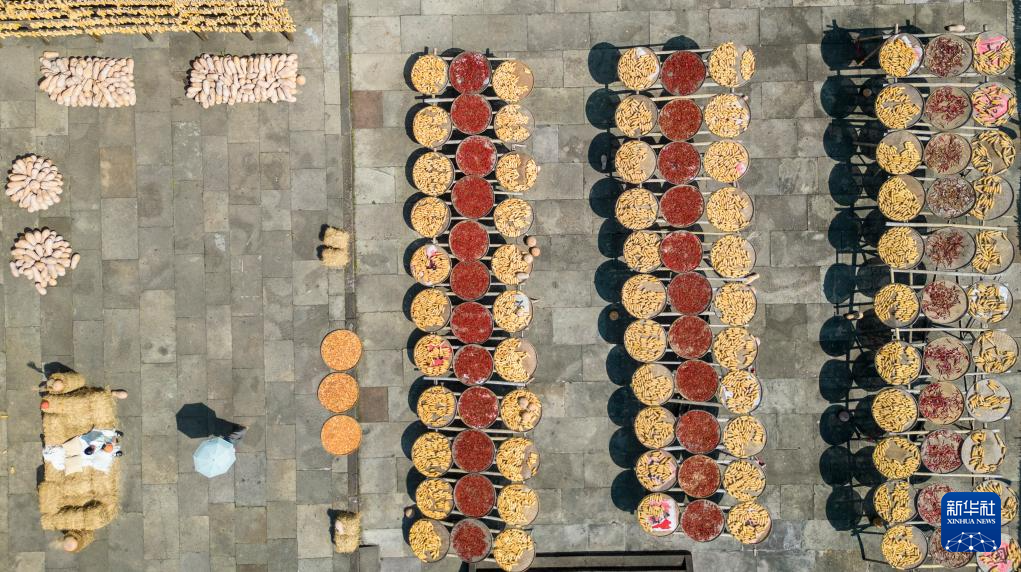 地处皖南山区的安徽省黄山市徽州区呈坎古村自古都有晒秋习俗。近年来,晒秋时节,该村村民会将农作物在村中广场集中晾晒,构成一幅五谷丰登的秋收画卷,吸引不少游客前往观赏,成为当地秋日里的旅游特色。