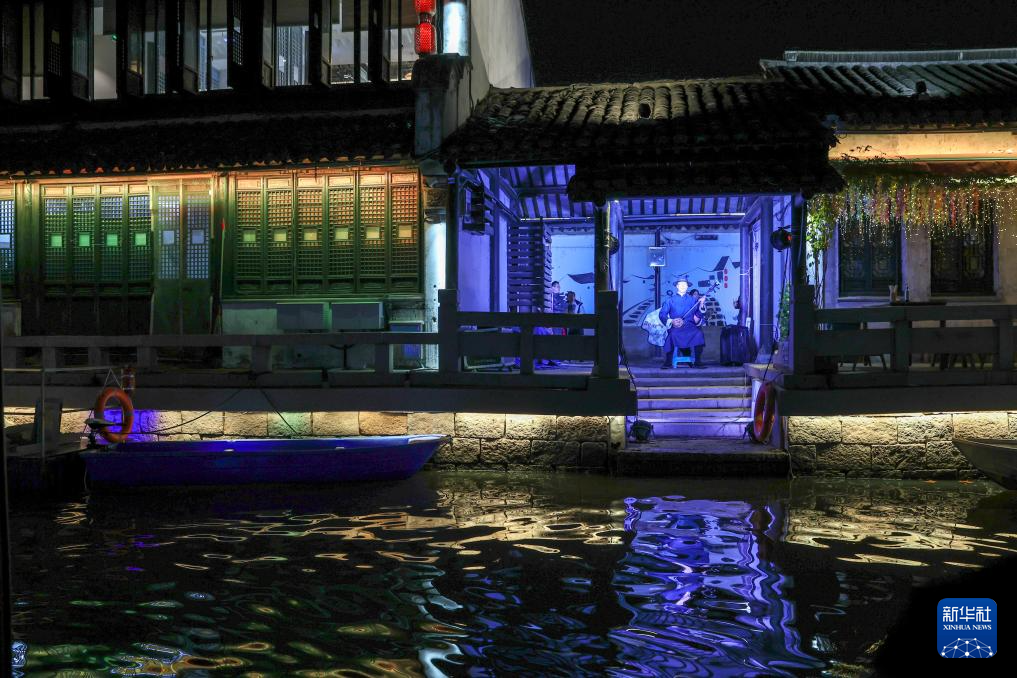 演员在古运河畔的清名桥历史文化街区表演评弹(12月7日摄)。