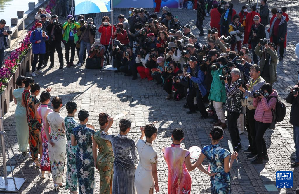 摄影爱好者在古运河畔的清名桥历史文化街区拍摄旗袍秀(12月8日摄)。