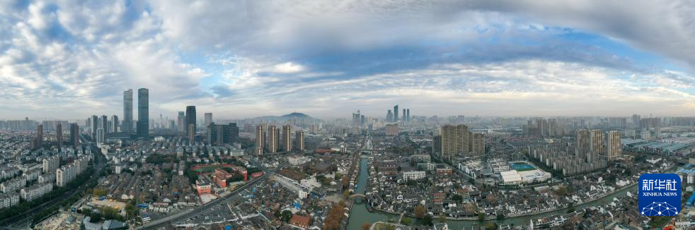 古运河畔的清名桥历史文化街区与市区晨景(无人机全景照片,12月9日摄)。