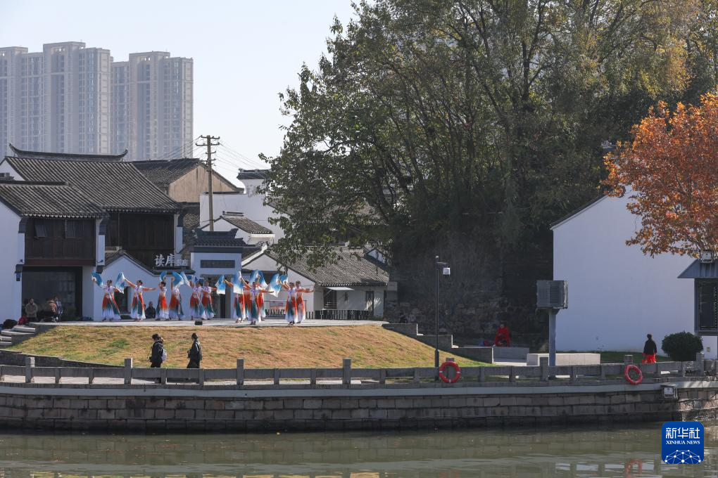 舞蹈爱好者在古运河畔的清名桥历史文化街区表演节目(12月8日摄)。