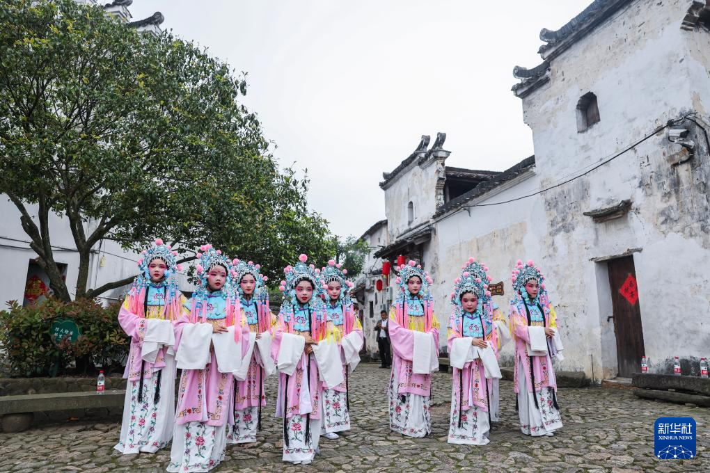 当日,浙江省建德市大慈岩镇新叶村举行“新叶三月三”特色民俗非遗展演。建德、兰溪、龙游三地的“李村抬阁”“新叶昆曲”“龙游硬头狮子”“畲族竹竿舞”等十余项非遗传统节目在新叶古村轮番上演。