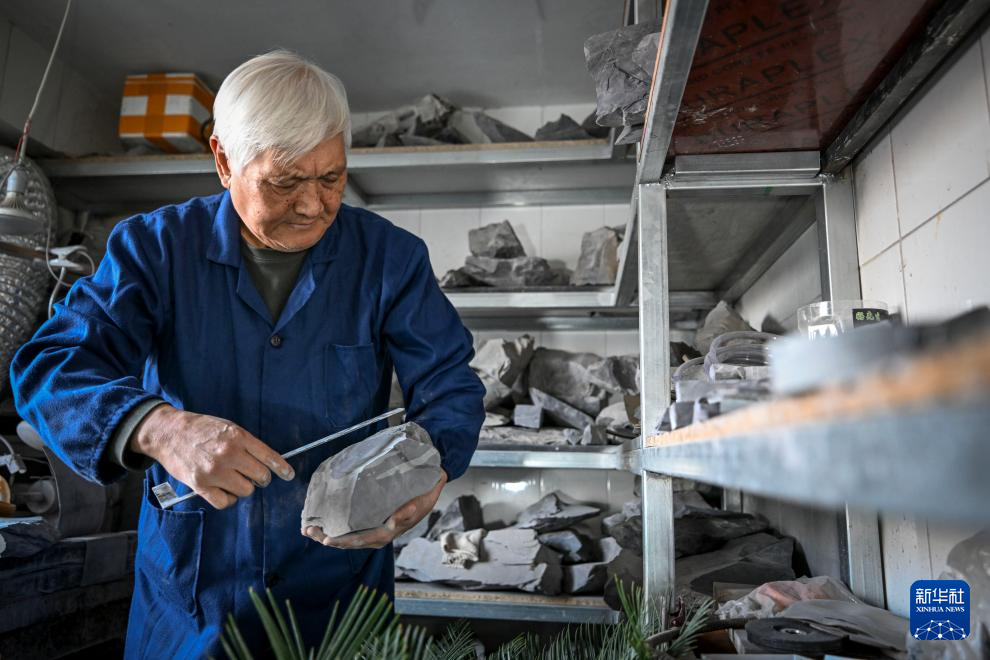 闫森林在工作室擦拭用来制砚的贺兰石(3月8日摄)。