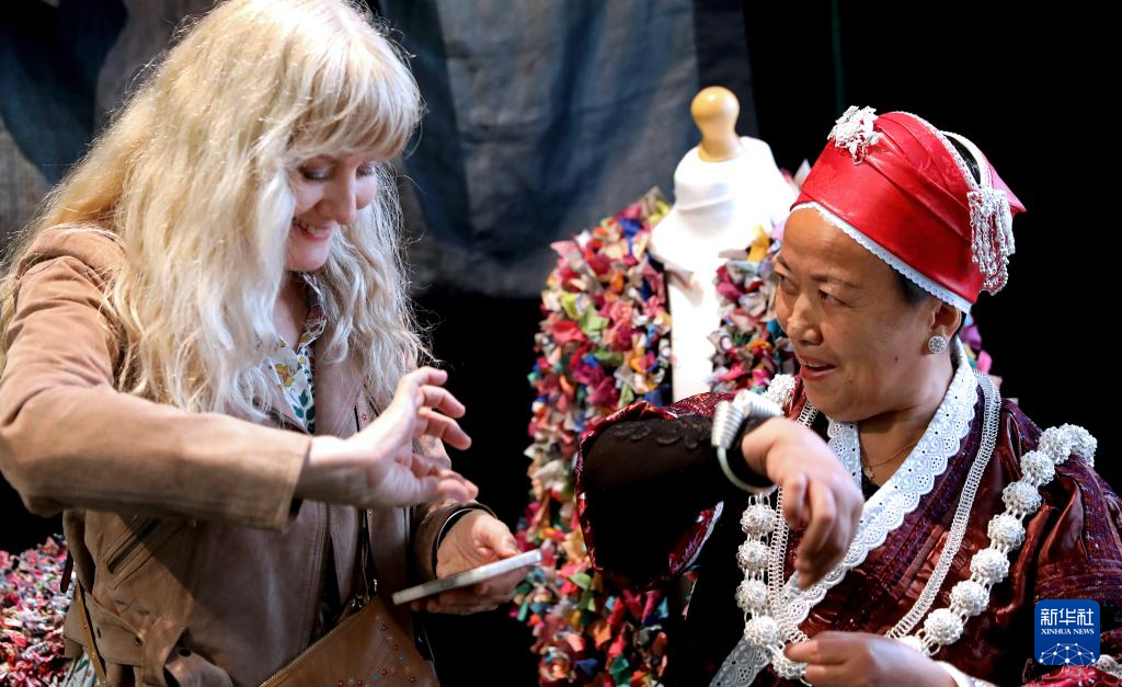 5月13日,在英国伦敦手工艺周“设计中国·和韵华夏”主题展上,英中贸易协会执行董事莉丝·贝特尔森(左)向中国手工艺人学习苗绣手法。