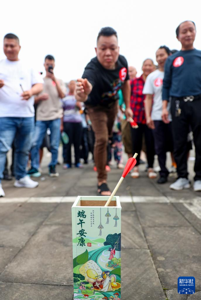 6月6日,四川省华蓥市高兴镇的群众在参加趣味投壶比赛。