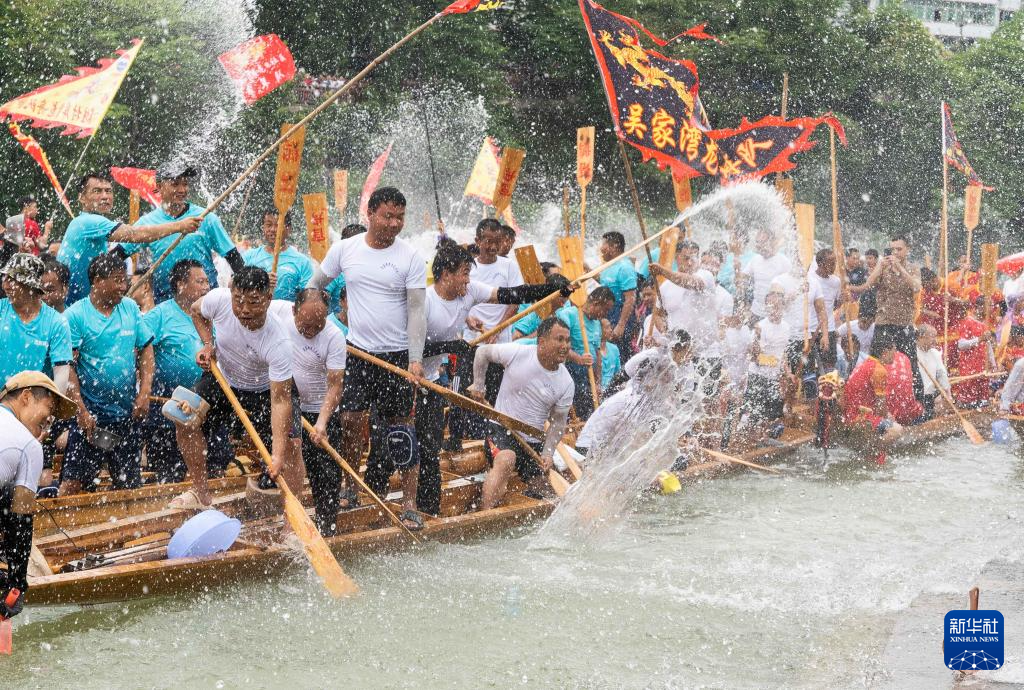 6月1日,龙舟在贵州省铜仁市碧江区锦江河上进行巡游展演,人们泼水互送祝福。