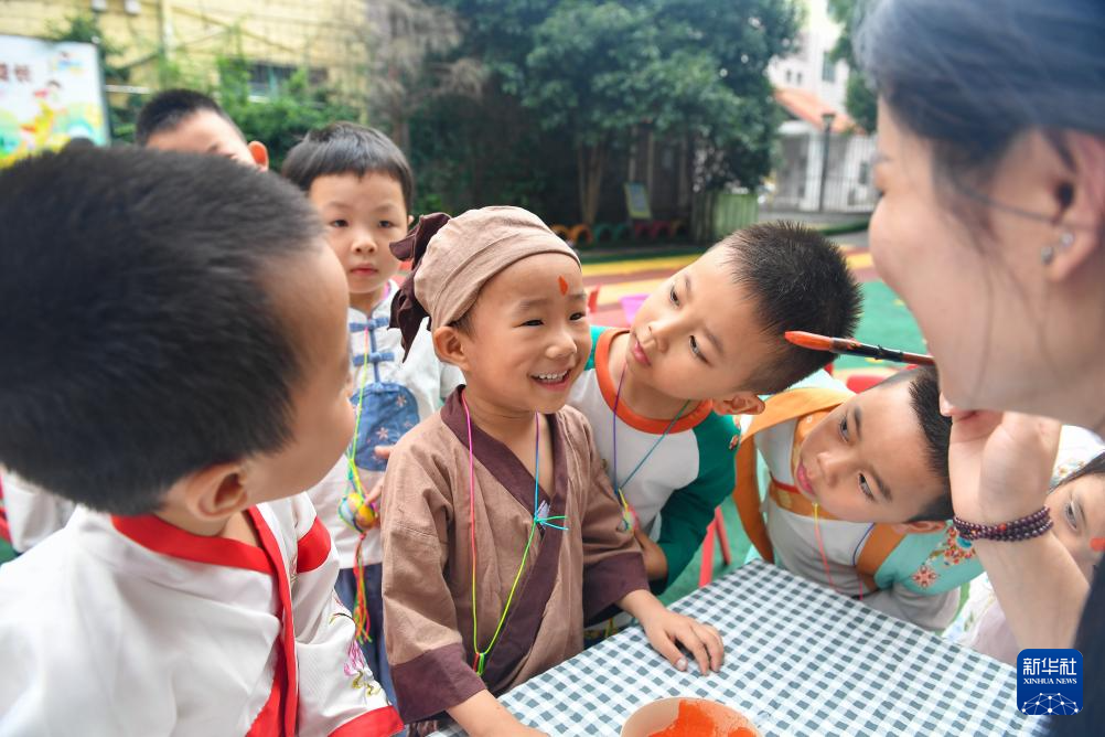 6月6日,在江西省吉安市吉州区一家幼儿园,老师为小朋友们“点雄黄”。