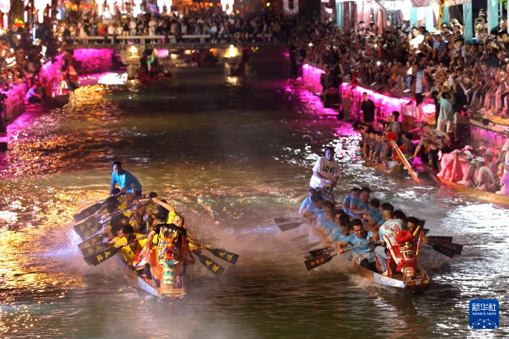 6月8日晚,在福建省福州市长乐区江田镇三溪村,人们参加夜赛龙舟比赛。