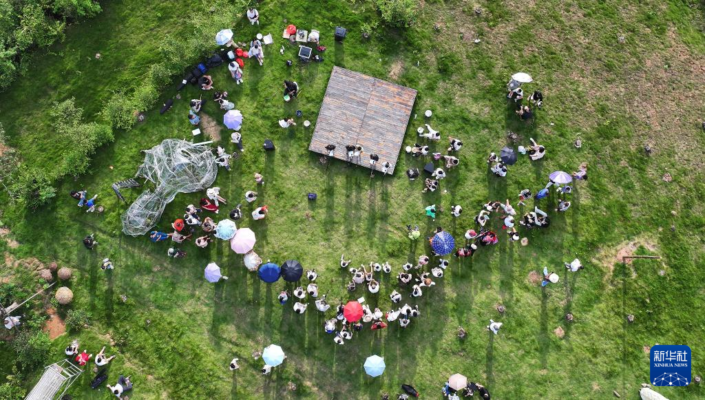 8月25日,孩子们在大元社乡村青少年艺术节上表演(无人机照片)。