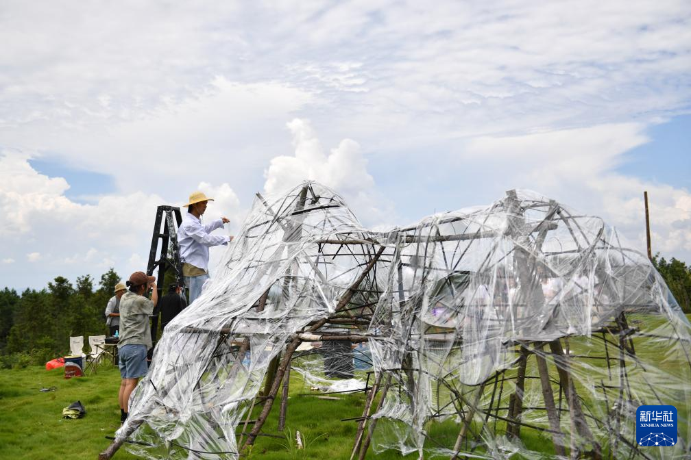 8月25日,大元社的老师们在搭建装置艺术作品“云朵屋”。