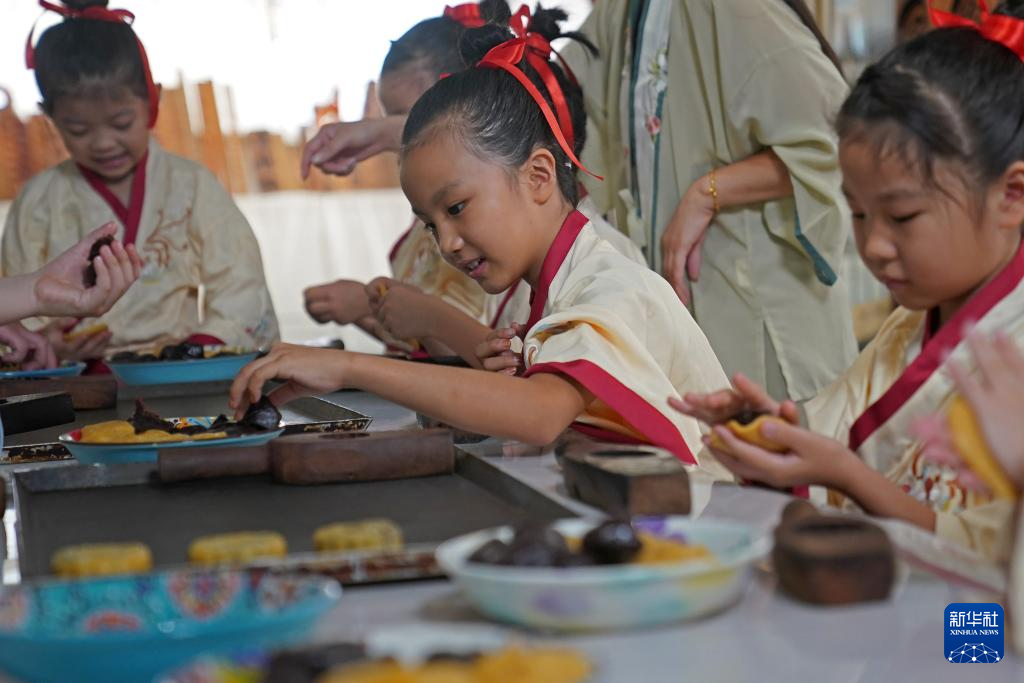 9月11日,孩子们在活动上体验传统手工月饼制作。