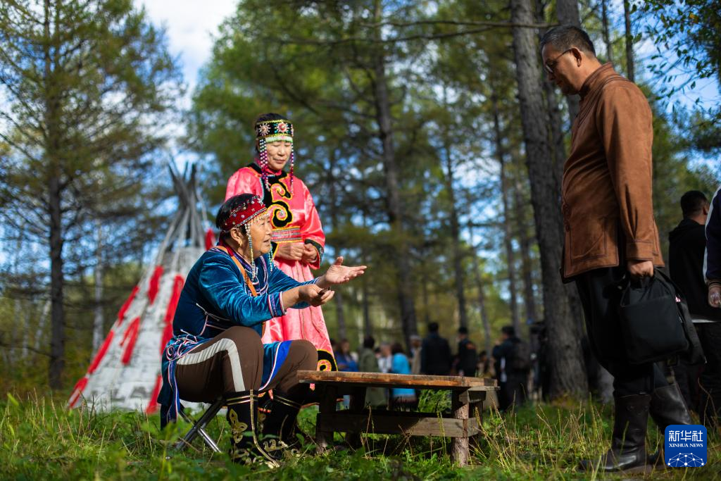 9月12日,在新生鄂伦春族乡新生村的民俗体验区,鄂伦春族群众演示传统婚俗。