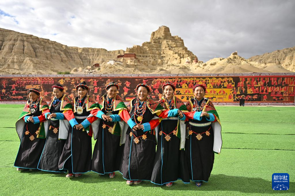 在西藏阿里地区札达县古格王国遗址脚下,当地村民表演“宣舞”后互相交流(9月11日摄)。