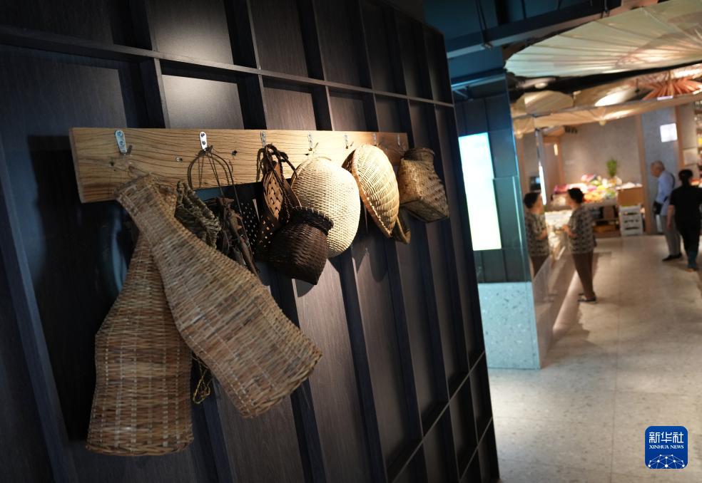 改造升级后松木场农贸市场装饰墙上的鱼篓等物件(9月23日摄)。