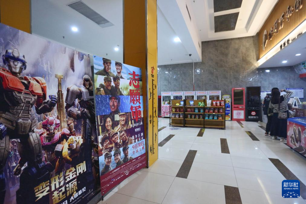 10月7日,在山东省临沂市郯城县一家影城,观众从电影海报前走过。