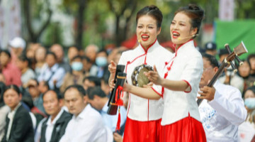 10月11日,佩戴藏族刺绣头帕的妇女在四川省丹巴县县城参加活动。