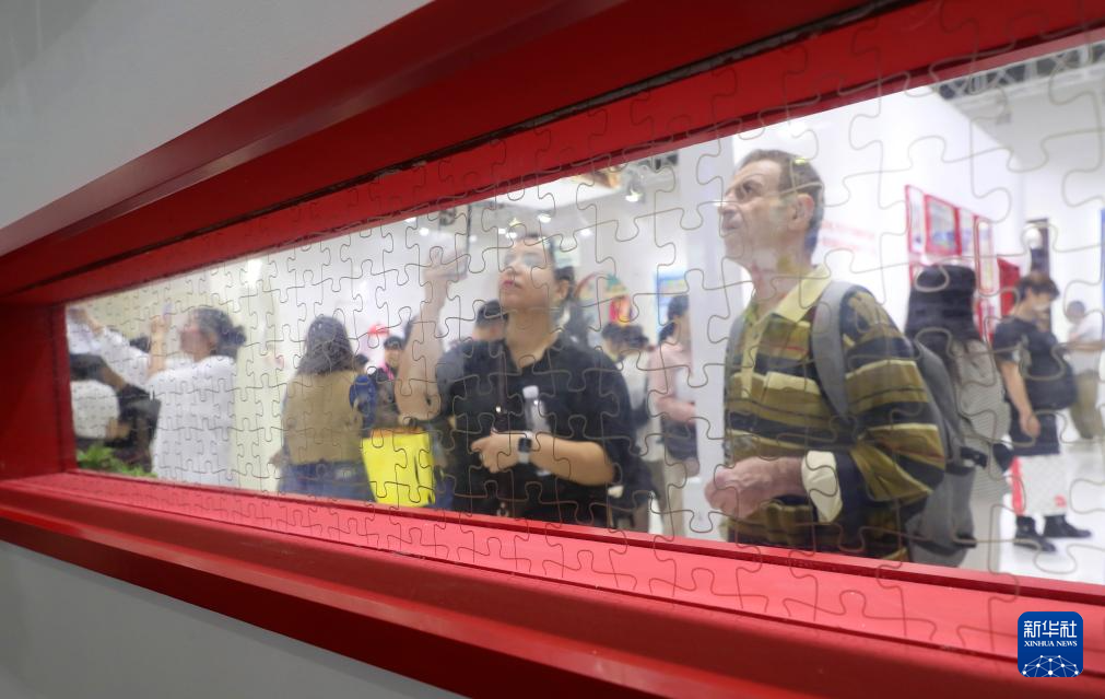 10月16日,参观者在一家拼图品牌企业展台上驻足观看。