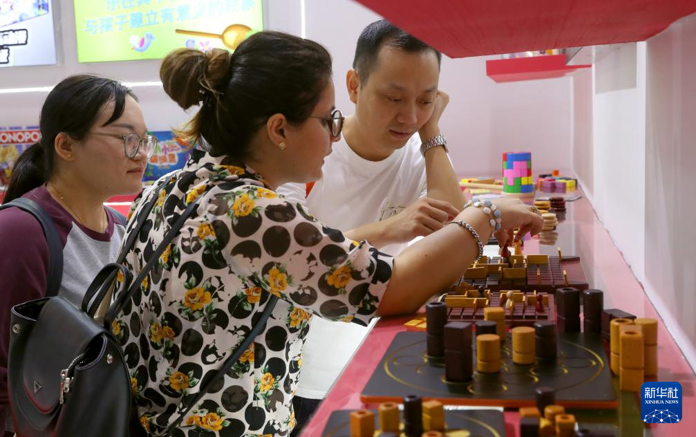 10月16日,参观者在展会现场体验一款益智棋游戏。