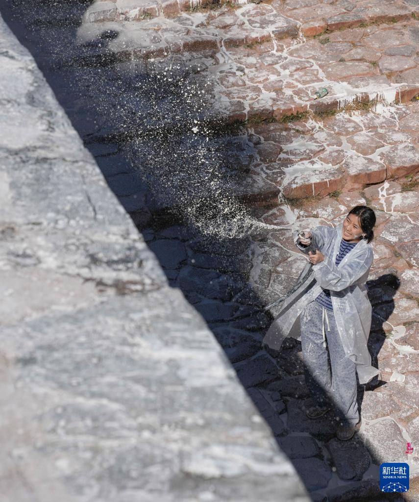 10月28日,布达拉宫管理处的工作人员在喷洒涂料。