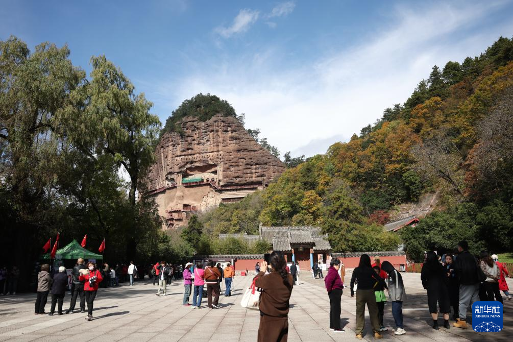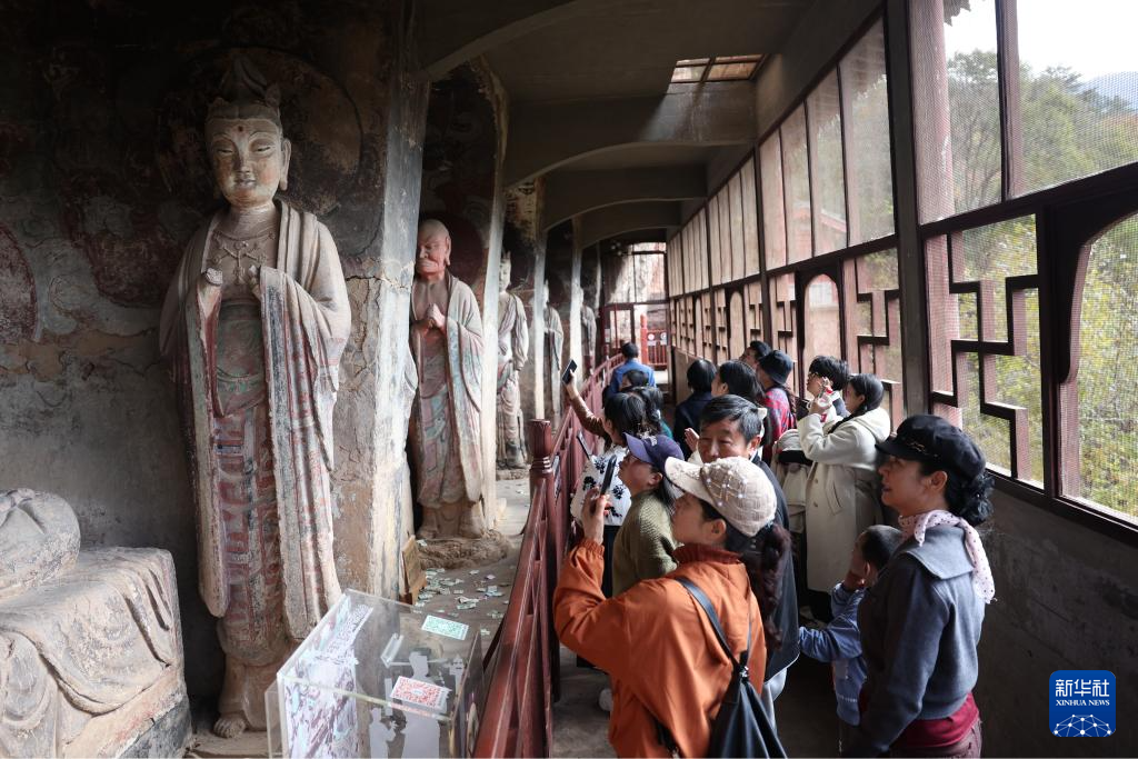 游客在麦积山石窟参观(11月2日摄)。