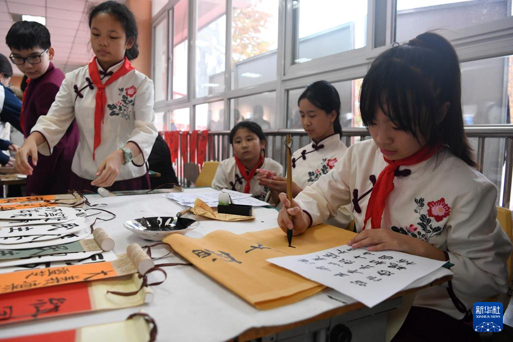 11月13日,在北京市第四中学顺义分校活动现场,来自顺义区木林中心小学校的学生展示书法。
