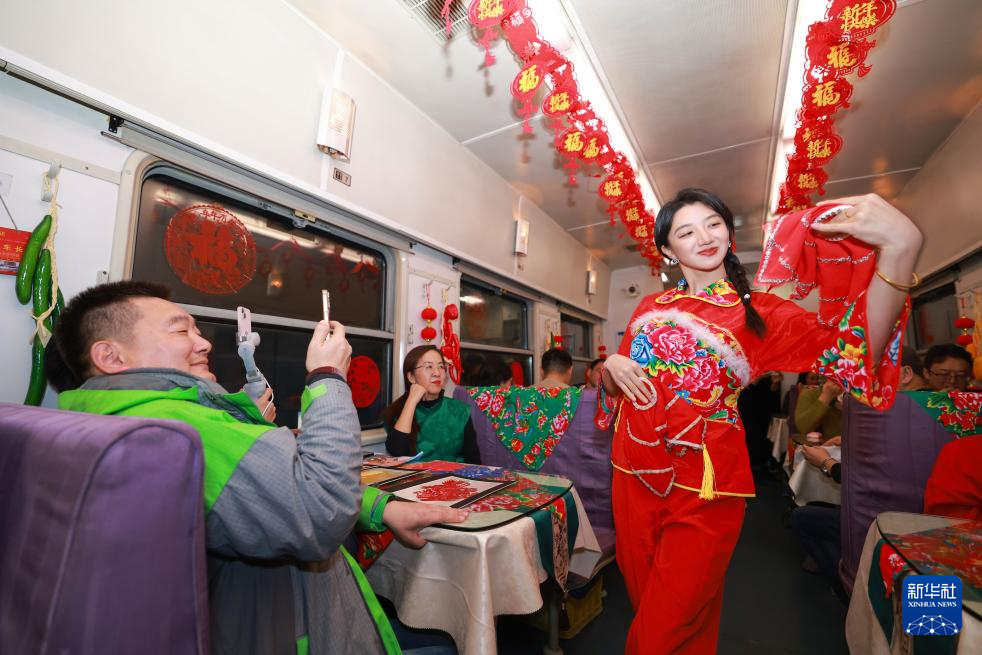 11月25日晚,被誉为“雪国列车”的K7041次列车驶出哈尔滨,开往“神州北极”漠河。这是今年冬天黑龙江省开行的首趟东北民俗主题旅客列车。旅途中,车内挂窗花、贴福字、铺东北大花布,乘务员穿上东北大花袄,为旅客献上东北民俗演出。