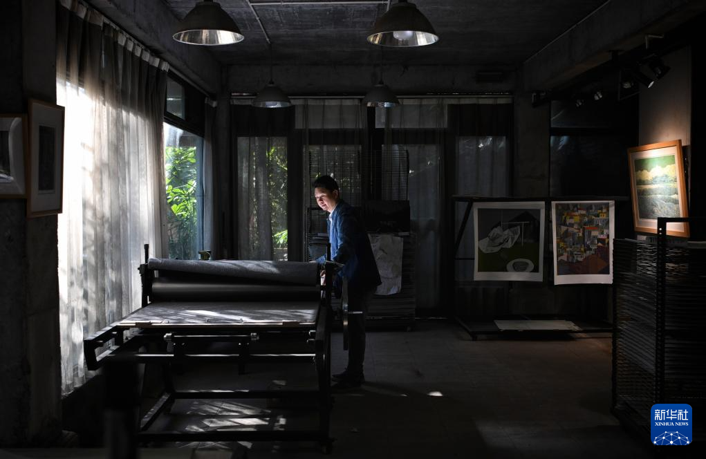 12月9日,在云南普洱学院那柯里绝版木刻教学实践基地,绝版木刻画师在进行版画创作。